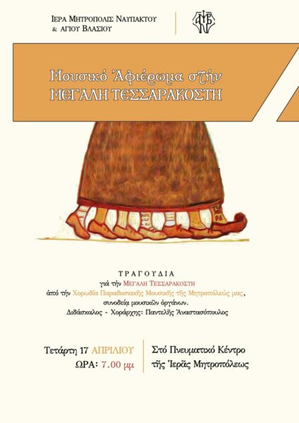 Τραγούδια για τη Μεγάλη Τεσσαρακοστή από τη Χορωδία Παραδοσιακής Μουσικής της Ιεράς Μητροπόλεως Ναυπάκτου και Αγίου Βλασσίου συνοδεία μουσικών οργάνων, κατά την Τετάρτη 17 Απριλίου 2019 και ώρα 7.00 .μ. στο Πνευματικό Κέντρο της Μητροπόλεως.