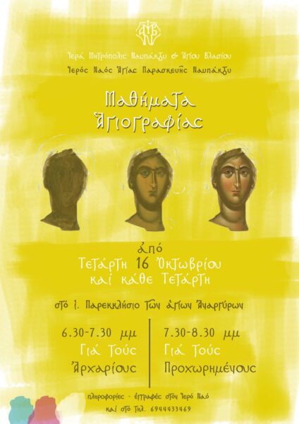 ΜΑΘΗΜΑΤΑ ΑΓΙΟΓΡΑΦΙΑΣ εκ μέρους της Ενορίας Ι.Ν. Αγίας Παρασκευής Ναυπάκτου από Τετάρτη 16 Οκτωβρίου και κάθε Τετάρτη στο Ι. παρεκκλήσιο των Αγίων Αναργύρων – ΓΙΑ ΑΡΧΑΡΙΟΥΣ και ΓΙΑ ΠΡΟΧΩΡΗΜΕΝΟΥΣ.