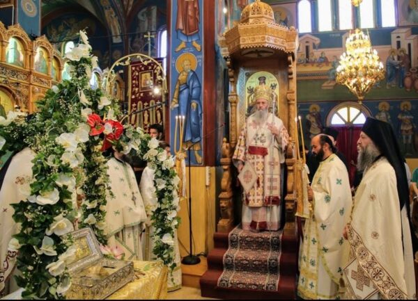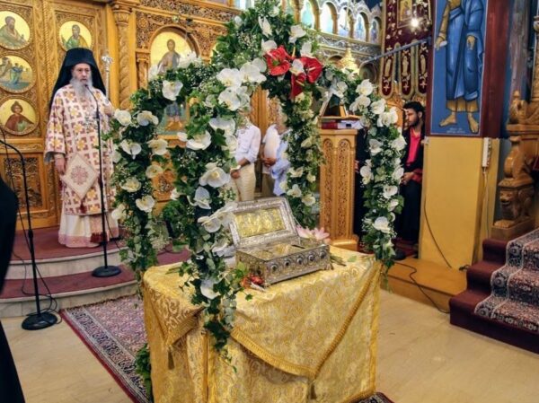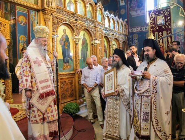 Στό τέλος τῆς θείας Λειτουργίας ὁ Σεβασμιώτατος εὐχαρίστησε τήν Ἱερά Μονή Σίμωνος Πέτρας καί τόν Ἡγούμενο Ἀρχιμ. Ἐλισσαῖο Σιμωνοπετρίτη γιά τήν ἀποστολή τῶν ἱερῶν κειμηλίων μέ τήν συνοδεία τριμελοῦς ἀντιπροσωπίας Μοναχῶν, καί τόν ἐπήνεσε γιά τήν προσφορά του στήν Ἐκκλησία. Μνημόνευσε δέ καί τόν κεκοιμημένο Ἀρχιμανδρίτη πρώην Ἡγούμενο τῆς Μονῆς π. Αἰμιλιανό γιά τήν προσφορά του στόν μοναχισμό καί τήν Ἐκλησία.