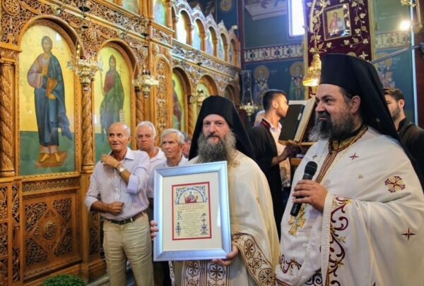 Τέλος, ὁ Ἐφημέριος τῆς Ἐνορίας Ἀντιρρίου π. Πολύκαρπος προσέφερε στόν ἱερομόναχο π. Γερβάσιο Σιμωνοπετρίτη μιά ἀναμνηστική διακοσμημένη ἐπιγραφή καί στόν Σεβασμιώτατο κ. Ἱερόθεο προσέφερε μιά χριαλίδα γιά τό ἅγιο Εὐχέλαιο, πού συμβολίζει τήν χρίση τῶν πιστῶν μέ τό ἔλαιο τῆς ἀρχιερωσύνης καί τῆς θεολογίας.