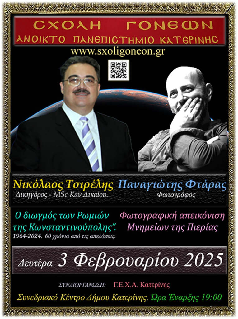 Η επόμενη εκδήλωση θα πραγματοποιηθεί την Δευτέρα 3 Φεβρουαρίου 2025 με επίσημο ομιλητή και καλεσμένο τον Δικηγόρο – MSc Κανονικού Δικαίου κ. Νικόλαο Τσιρέλη με θέμα: «Ο Διωγμός των Ρωμιών της Κωνσταντινούπολης (60 χρόνια από τις απελάσεις 1964-2024)» Στην Έναρξη της εκδήλωσης θα γίνει η παρουσίαση της Φωτογραφικής Απεικόνισης Μνημείων της Πιερίας από τον Φωτογράφο κ. Παναγιώτη Φτάρα.
