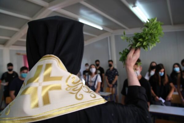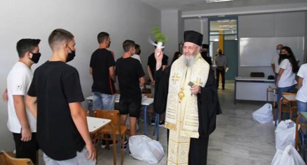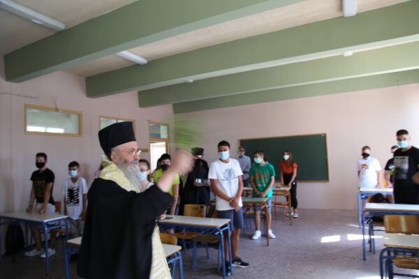 Στη συνέχεια ο Σεβασμιώτατος συνοδευόμενος από τους Διευθυντές των Σχολείων –Ιωάννα Κουτσογιάννη, Στέφανο Τέφα, Πέτρο Πιτσιάκκα, Αντώνιο Μπέκο– πέρασε από όλες τις τάξεις και των Λυκείων και των Γυμνασίων και από τα Γραφεία των Καθηγητών, ράντισε με τον αγιασμό τα παιδιά και τα κτήρια, και σε κάθε τάξη έλεγε κατάλληλες ευχές και επιστηρικτικούς λόγους στα παιδιά και στους Καθηγητές.