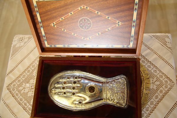 Όσοι εκκλησιάσθηκαν στο νέο και πρώτο Παρεκκλήσιο του Αγίου Καλλινίκου, μεταξύ των οποίων ο Δήμαρχος Ναυπακτίας κ. Βασίλειος Γκίζας, που έχει συγγένεια με τον Άγιο, είχαν επίσης την ευκαιρία να προσκυνήσουν το τίμιο λείψανο της δεξιάς χειρός του Αγίου και την ιερά εικόνα του και να λάβουν ως ευλογία και αναμνηστικό εικόνα του Αγίου.