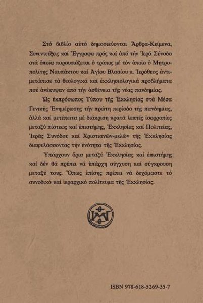 Επίσης, παρατηρεί κανείς και τον τρόπο με τον οποίο αντιμετώπισε το θέμα η Ιερά Σύνοδος της Εκκλησίας της Ελλάδος, γι’ αυτό και αφιερώνεται «στον Μακαριώτατο Αρχιεπίσκοπο Αθηνών και πάσης Ελλάδος κ. Ιερώνυμο και τα Μέλη της Ιεράς Συνόδου που διαχειρίσθηκαν το θέμα της πανδημίας με διάκριση και νηφαλιότητα».