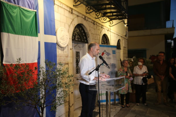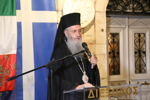 Στην τελετή των εγκαινίων που πραγματοποιήθηκε στον πεζόδρομο της “Διεξόδου”, ο Σεβασμιώτατος κ. Ιερόθεος, στην προσλαλιά του, μετέφερε τις ευχές του Μακαριωτάτου Αρχιεπισκόπου Αθηνών και πάσης Ελλάδος κ.κ. Ιερωνύμου, τον όποιο εκπροσωπούσε και αναφέρθηκε σε κοινά πολιτιστικά, φιλοσοφικά και ιστορικά στοιχεία της Ιταλίας και της Ελλάδος.