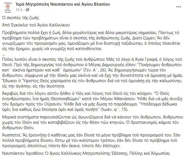 “Ο σκοπός της ζωής” μέσα από Εγκύκλιο του Αγίου Καλλινίκου Εδέσσης, όπως αυτή αναδημοσιεύεται απο την Ιερά Μητρόπολη Ναυπάκτου και Αγίου Βλασίου. “Μερικά συστήματα παρουσιάζονται ως αγωνιζόμενα διά να κάνουν τον άνθρωπον, άνθρωπον χωρίς τον Θεόν και τον καταβιβάζουν εις την θέσιν των κτηνών. Ο Χριστιανισμός κάμνει τον άνθρωπον Θεόν” ανέφερε, μεταξύ άλλων, ο νέος Άγιος της Ορθοδοξίας μας.