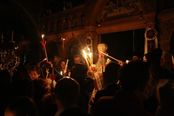 Πριν το «Χριστός ανέστη» ο Σεβασμιώτατος στον σύντομο χαιρετισμό του είπε ότι όπως η λαμπάδα έχει δύο χαρακτηριστικά, ότι φωτίζει και λιώνει, έτσι και εμείς πρέπει να φωτίζουμε το περιβάλλον μας και να λιώνουμε τον Θεό και για τους συνανθρώπους μας.