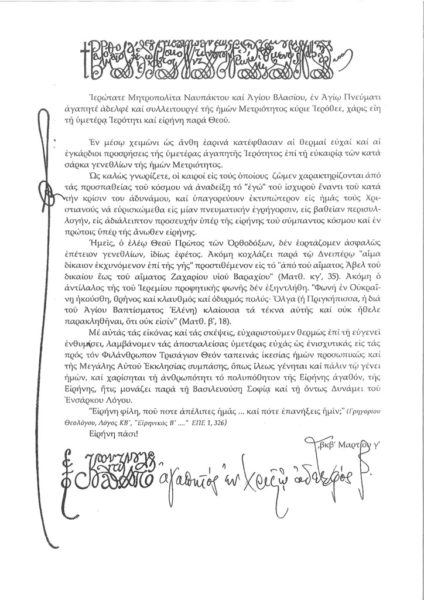 Πατριαρχική επιστολή στον Μητροπολίτη Ναυπάκτου για «Το κοχλάζον αίμα στον Δνείπερο»