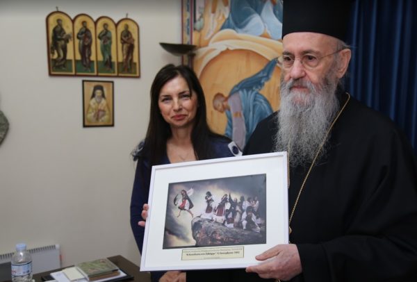 Ο Σεβασμιώτατος εξέφρασε στην Πρόεδρο του Συλλόγου κ. Μαρία Σαγώνα την χαρά και τον θαυμασμό του για την σκηνοθετική αναπαράσταση του χορού του Ζαλόγγου στην φωτογραφία που του προσέφεραν, η οποία θα τοποθετηθεί όπως είπε στα Γραφεία της Ιεράς Μητροπόλεως.