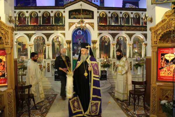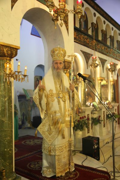 Ο Σεβασμιώτατος κ. Ιερόθεος στον λόγο του αναφέρθηκε στην μεγάλη εορτή της Κοιμήσεως της Θεοτόκου, λέγοντας ότι οι Χριστιανοί οφείλουμε να εισδύουμε στο βαθύτερο νόημα της εορτής και να μη παραμένουμε στην επιφάνεια και στα απλά ιστορικά γεγονότα. Υπογράμμισε τρία μεγάλα μηνύματα της εορτής της Κοιμήσεως της Θεοτόκου. Το πρώτο είναι το θεολογικό μήνυμα, ότι ο Θεός της Εκκλησίας μας είναι Θεός αγάπης που αγαπά τον άνθρωπο και προσέλαβε την ανθρώπινη φύση από την Υπεραγία Θεοτόκο για να τον σώση, και δεν είναι ο αφηρημένος Θεός της μεταφυσικής που είναι κλεισμένος στην ευδαιμονία του και την ακινησία του. Το δεύτερο είναι το ανθρωπολογικό, ότι ο άνθρωπος είναι πλασμένος κατ’ εικόνα και καθ’ ομοίωση Θεού για να φθάση στην θέωση, να γίνη θεούμενος, που είναι το ύψος της ορθοδόξου ανθρωπολογίας. Και το τρίτο μήνυμα είναι η υπέρβαση του θανάτου, αφού ο θάνατος που βασανίζει και ταλαιπωρεί τον άνθρωπο και τις κοινωνίες είναι κοίμηση. Και τα τρία αυτά μηνύματα εκφράζονται στην ζωή της Θεοτόκου και στην ένδοξη Κοίμηση και μετάστασή της.