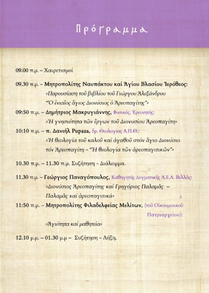 Η Ιερά Μητρόπολη Ναυπάκτου και Αγίου Βλασίου διοργανώνει το ΣΤ΄ Θεολογικό Συνέδριό της, στο Πνευματικό της Κέντρο, στην Ναύπακτο, το Σάββατο 3 Οκτωβρίου 2020, με γενικό θέμα: «Άγιος Διονύσιος Αρεοπαγίτης, βίος, έργο και θεολογία».