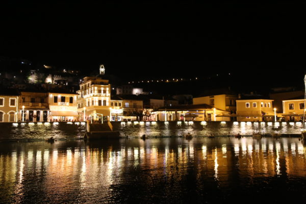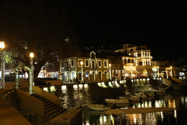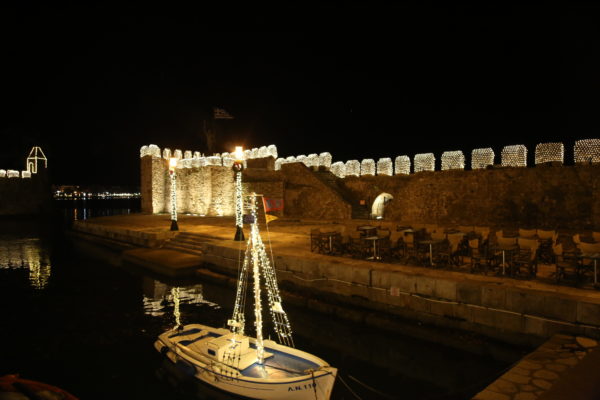 Η Ναύπακτος που είναι φωταγωγημένη χριστουγεννιάτικα, ειδικά το πανέμορφο λιμανάκι της το οποίο βρίσκεται δίπλα από την επισκοπική κατοικία.