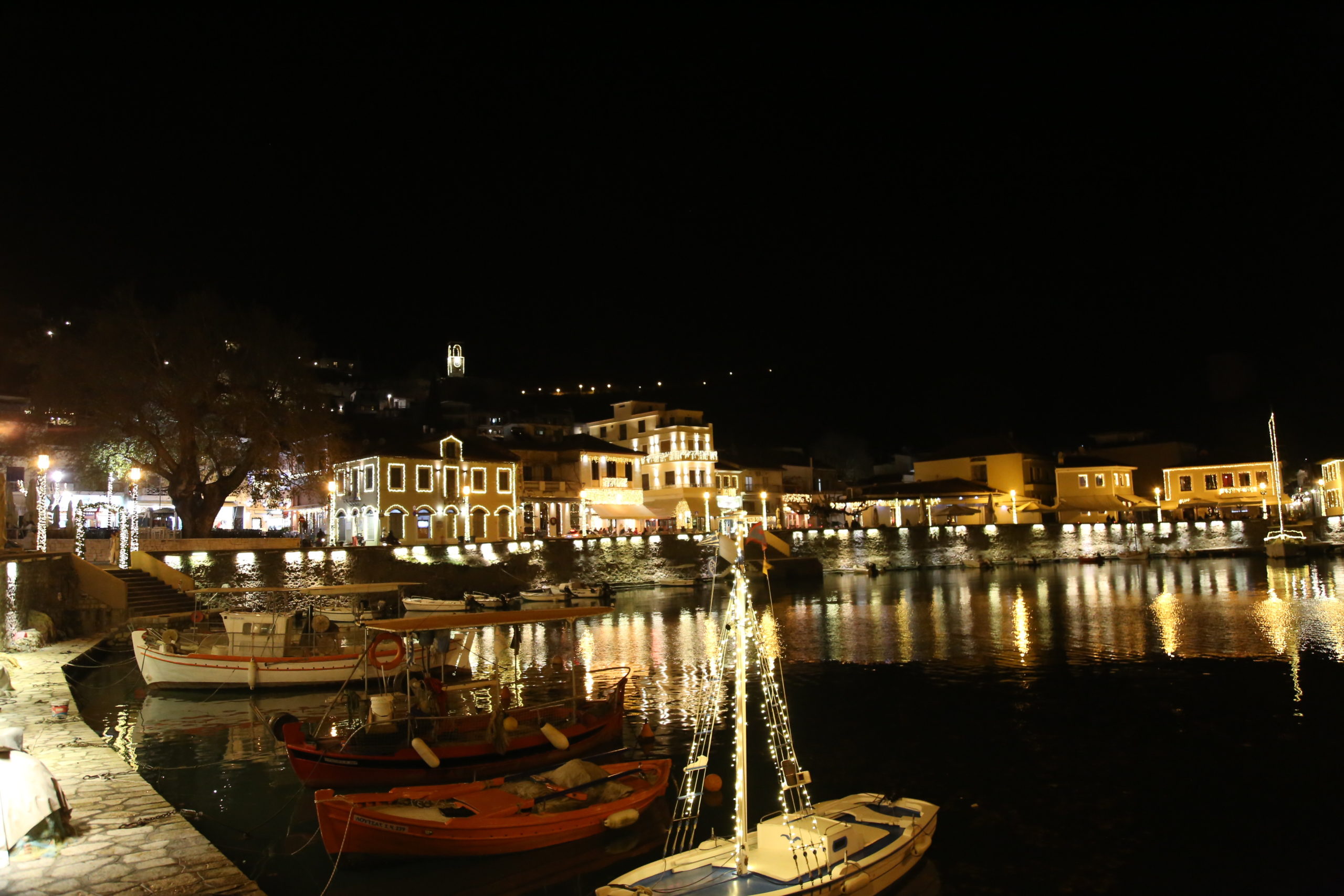 Η Ναύπακτος που είναι φωταγωγημένη χριστουγεννιάτικα, ειδικά το πανέμορφο λιμανάκι της το οποίο βρίσκεται δίπλα από την επισκοπική κατοικία.