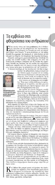 Ἄλλωστε, ἡ σύγχρονη μοριακή βιολογία ἔχει ἀποδείξει ὅτι μεταξύ τῶν 25.000 γονιδίων πού ὑπάρχουν στό DNA τοῦ ἀνθρώπινου κυττάρου ὑπάρχουν καί τά γονίδια τῆς γηράνσεως, δηλαδή τοῦ θανάτου, καί τά γονίδια τῶν σωματικῶν ἀσθενειῶν. Δηλαδή, ἀπό τήν πρώτη στιγμή τῆς συλλήψεώς μας, ἔχουμε μέσα μας τήν φθαρτότητα καί τήν θνητότητα.