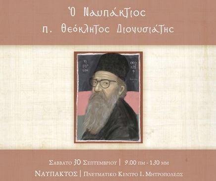 Το Σάββατο 30 Σεπτεμβρίου 2023, στο Πνευματικό της Κέντρο η Ιερά Μητρόπολη Ναυπάκτου και Αγίου Βλασίου διοργανώνει το Θ΄ Θεολογικό Συνέδριο, με την ευκαιρία της εορτής του αγίου Ιεροθέου Α΄ Επισκόπου Αθηνών με γενικό θέμα: «Ο Ναυπάκτιος π. Θεόκλητος Διονυσιάτης».