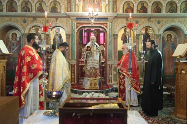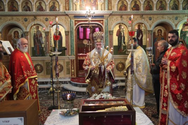 Στα προπύλαια τελέσθηκε δέηση και κατόπιν ο Σεβασμιώτατος εισόδευσε το ιερό Λείψανο στο Ιερό Ναό και το απόθεσε προς προσκύνηση στο μέσον του Ιερού Ναού, προ του Δεσποτικού Θρόνου, σε κατάλληλα ευτρεπισμένο τραπέζι.