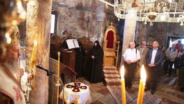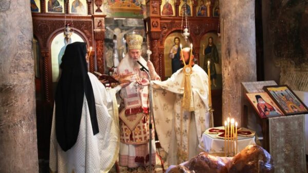 Μετά το πέρας της θείας Λειτουργίας ο Σεβασμιώτατος συνομίλησε με τους εκκλησιασθέντες στο προαύλιο της Ιεράς Μονής.