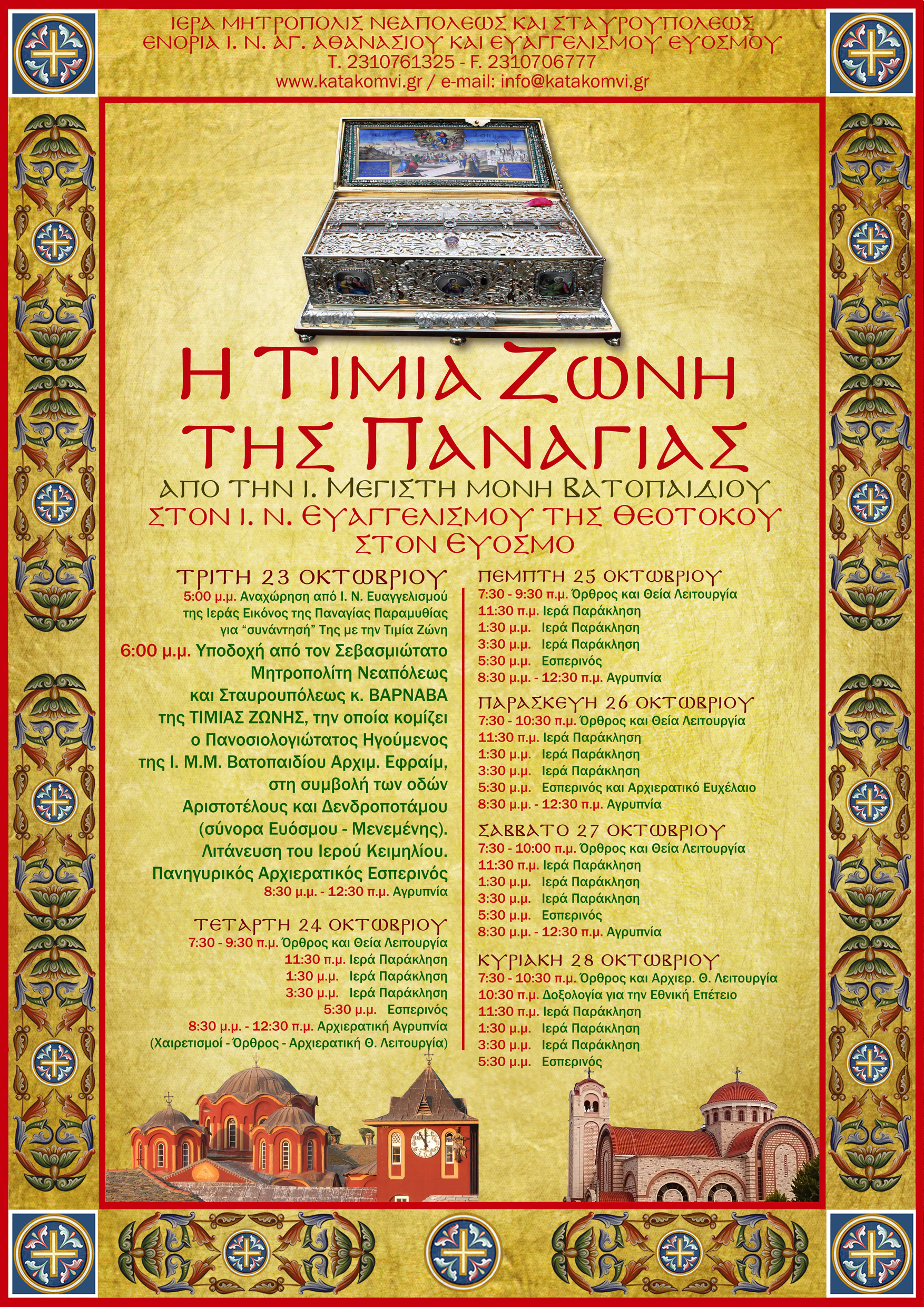 Στις 23 Οκτωβρίου στις 6 μ.μ. ο Σεβασμιώτατος Μητροπολίτης Νεαπόλεως και Σταυρουπόλεως κ. Βαρνάβας θα υποδοχθεί την Αγία Ζώνη, την οποία κομίζει ο Πανοσιολογιώτατος Ηγούμενος της Ι.Μ.Μ. Βατοπαιδίου Αρχιμ. Εφραίμ στην συμβολή των οδών Αριστοτέλους και Δενδροποτάμου (σύνορα Ευόσμου -Μενεμένης). Θα ακολουθήσει Πανηγυρικός Αρχιερατικός Εσπερινός και Αγρυπνία.