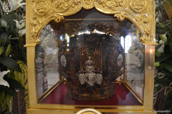 Αυτό το ακάνθινο στεφάνι, αγαπητοί μου αδελφοί, μαζί με ένα επιμάνικο από την αρχιερατική στολή τού από Δράμας Μητροπολίτη Σμύρνης Χρυσοστόμου, έχουμε την τιμή και την ευλογία να προβάλουμε σήμερα στον Καθεδρικό μας Ναό, ως ορατό σημάδι της ματωμένης Ρωμιοσύνης. Ένα ακριβό κειμήλιο, που ο μακαριστός Μητροπολίτης Δράμας Παύλος και φίλος καρδιάς, το ’χε φυλαγμένο, για να το παραδώσει στον διάδοχό του, μαζί με την πολύτιμη ιστορία του, ως παρακαταθήκη αφοσίωσης και χρέους.
