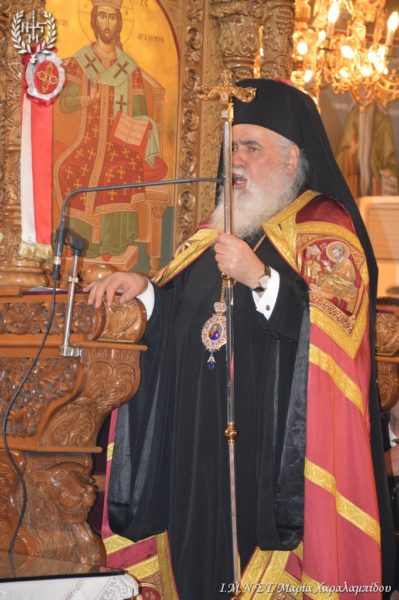 Ο Πρωτοσύγκελλος , Πανοσιολογιώτατος Αρχιμανδρίτης π. Διονύσιος Πατσάνης, στο κήρυγμά του, παρουσίασε τη βιοτή και το πλούσιο έργο του ουρανοβάμονος Αγίου Βασιλείου. Στη συνέχεια, ο Πρωτοσύγκελλος, ανακάλεσε τα σημαντικότερα γεγονότα της χρονιάς που πέρασε υπογραμμίζοντας την πλούσια φιλανθρωπική δράση και το εκτεταμένο κοινωνικό , εκπαιδευτικό και πολιτιστικό έργο της Μητρόπολης.