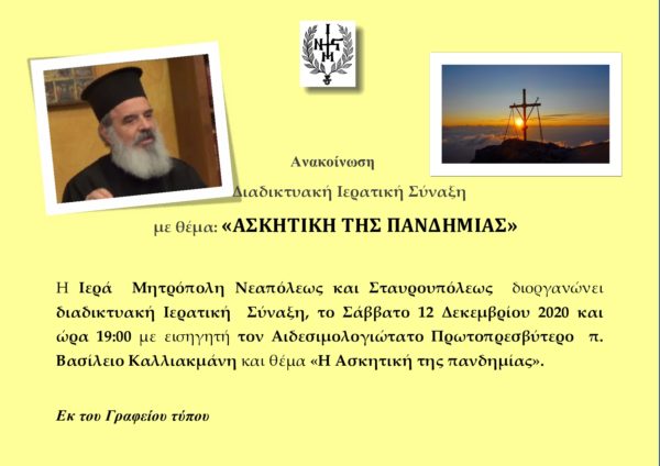 ΔΙΑΔΙΚΤΥΑΚΗ ΙΕΡΑΤΙΚΗ ΣΥΝΑΞΗ ΤΗΣ ΙΕΡΑΣ ΜΗΤΡΟΠΟΛΕΩΣ ΝΕΑΠΟΛΕΩΣ ΚΑΙ ΣΤΑΥΡΟΥΠΟΛΕΩΣ θα λάβει χώρα κατά το Σάββατο 12 Δεκεμβρίου 2020 και ώρα 19.00 με εισηγητή τον Πρωτοπρεσβύτερο π. Βασίλειο Καλλιακμάνη υπό το θέμα: “Η ασκητική της πανδημίας”.