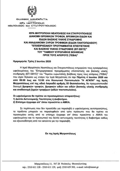 Τη διανομή βρεφικών τροφών και ειδών και ειδών βασικής υλικής συνδρομής καθώς και ξηρών τροφίμων σε απόρους ανακοίνωσε για μεθαύριο Πέμπτη η Ιερά Μητρόπολη Νεαπόλεως και Σταυρουπόλεως. Ως εταίρος του επιχειρησιακού προγράμματος επισιτιστικής και βασικής υλικής συνδρομής του ΤΕΒΑ, η Μητρόπολη θα μοιράζει μεθαύριο τα ανωτέρω είδη από τις 9.00 το πρωί έως τις 12.00 το μεσημέρι, στο Κοινωνικό Παντοπωλείο «Η αγάπη», στην οδό Λαγκαδά 53.