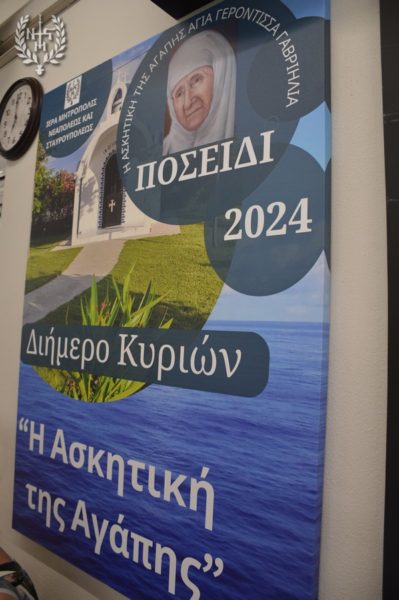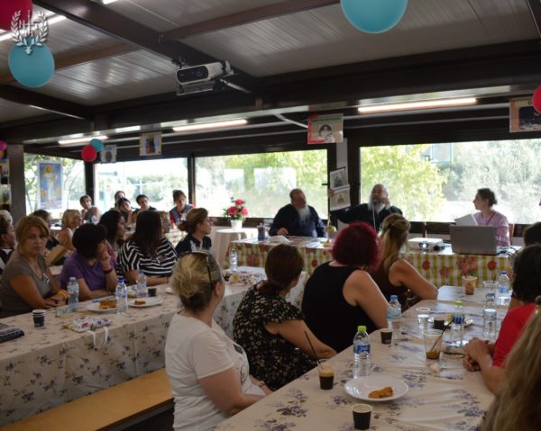 Οι κατασκηνώτριες, οι οποίες προέρχονταν από διάφορες Ενορίες της Ιεράς Μητρόπολης, είχαν την ευκαιρία, το πρώτο απόγευμα, να ακούσουν μία ομιλία από τον π. Αντύπα Νικηταρά με τίτλο: «Η κατά άμφω διακονία της Οσίας Γερόντισσας Γαβριηλίας». Ο ομιλητής ανακάλεσε στιγμές από την προσωπική του επικοινωνία με την προσφάτως αγιοκαταταχθείσα Οσία Γερόντισσα και μετέδωσε στις κατασκηνώτριες τα βασικά σημεία της διδασκαλίας της. Οι κυρίες, μετά το πέρας της Εισήγησης, προσκύνησαν απότμημα του ιερού λειψάνου της Αγίας καθώς και του Οσίου Αμφιλοχίου του Μακρή.