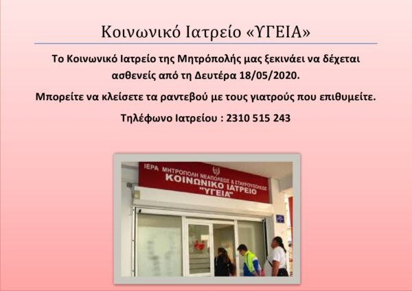 Κοινωνικό Ιατρείο ξεκινάει η Ιερά Μητρόπολη Νεαπόλεως και Σταυρουπόλεως όπου θα μπορεί ο κόσμος να κλείνει ραντεβού με το γιατρό που επιθυμεί από την Δευτέρα 18 Μαΐου 2020 και μετά. Το Κοινωνικό Ιατρείο με την ονομασία “Υγεία” θα δέχεται τηλεφωνήματα για ραντεβού στο τηλέφωνο: 2310 515 243.