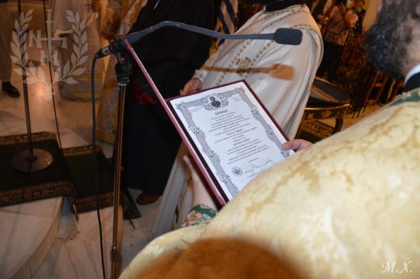 Ιδιαιτέρως συγκινητική υπήρξε η στιγμή κατά την οποία ο Σεβασμιώτατος απένειμε το χρυσό σταυρό στον, επί 64 έτη, διατελέσαντα ιεροψάλτη του Ναού, κ.Φώτιο Τζανίδη.