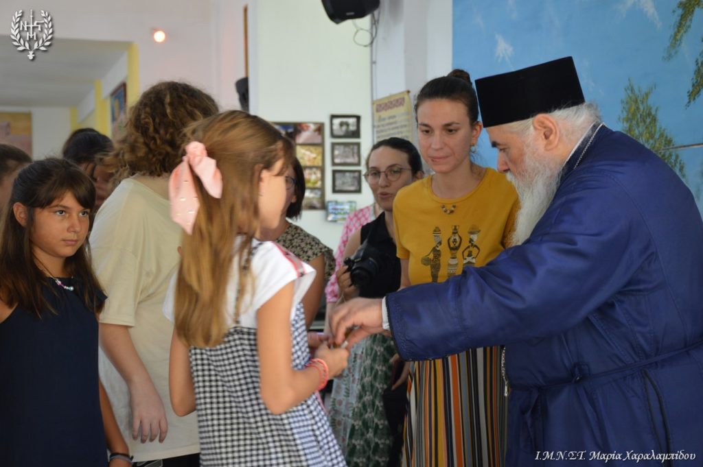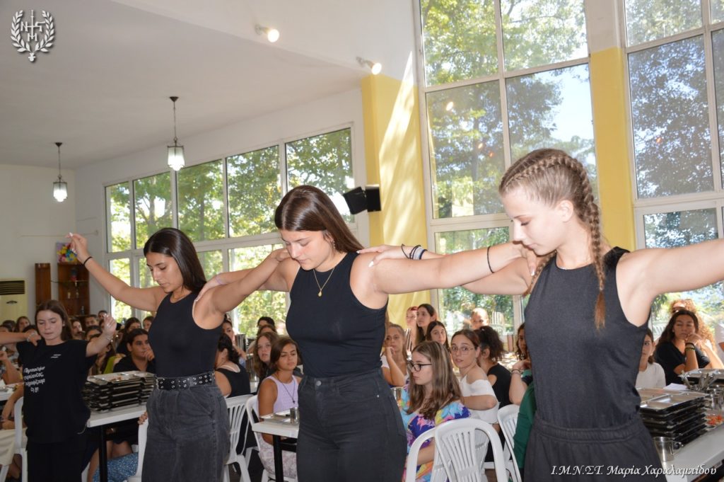 Οι 200 κατασκηνώτριες Γυμνασίου και Λυκείου υποδέχθηκαν το Σεβασμιώτατο και τη συνοδεία του με έκδηλη χαρά και παρουσίασαν ένα όμορφο πρόγραμμα με τραγούδια, χορό, με ταχυδακτυλουργικά και κωμικές παντομίμες.