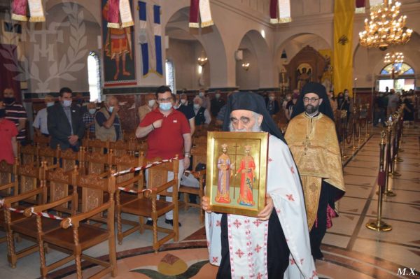 «Σε αυτό το αναστάσιμο κλίμα, λίγο μετά την Κυριακή των Μυροφόρων, είπε ο Σεβασμιώτατος στο κήρυγμά του, ο λειτουργικός χρόνος αποκαλύπτει δυο ιερά πρόσωπα που στολίζουν το χορό των Αγίων. Ο Συναξαριστής σημειώνει: των Αγίων θεοστέπτων βασιλέων Κωνσταντίνου και Ελένης.