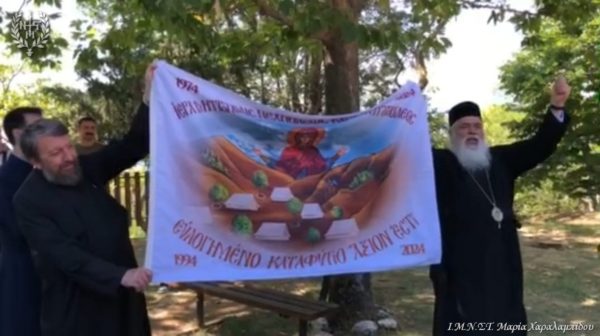 Στη συνέχεια, ο Ποιμενάρχης πρόσφερε στα παιδιά από ένα αναμνηστικό ενθύμιο, ενώ την ώρα της έπαρσης της σημαίας, παρουσίασε ενώπιον όλων των κατασκηνωτών τη σημαία-σύμβολο στην οποία αποτυπώνονται τα 50 χρόνια διακονίας στο χώρο της Κατασκήνωσης.