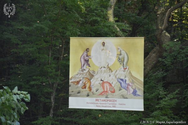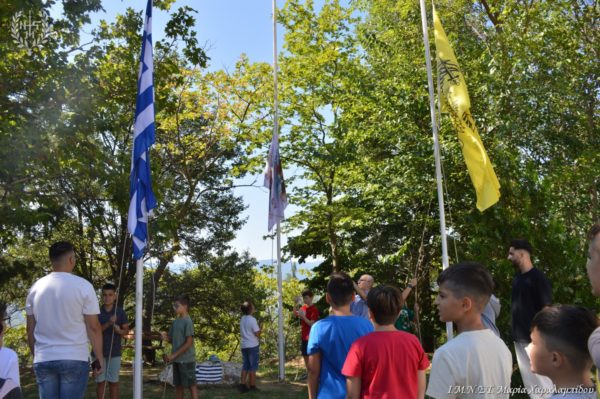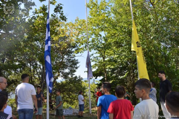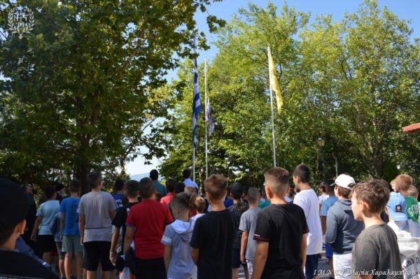 Στη συνέχεια, ο Ποιμενάρχης πρόσφερε στα παιδιά από ένα αναμνηστικό ενθύμιο, ενώ την ώρα της έπαρσης της σημαίας, παρουσίασε ενώπιον όλων των κατασκηνωτών τη σημαία-σύμβολο στην οποία αποτυπώνονται τα 50 χρόνια διακονίας στο χώρο της Κατασκήνωσης.