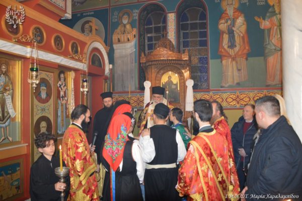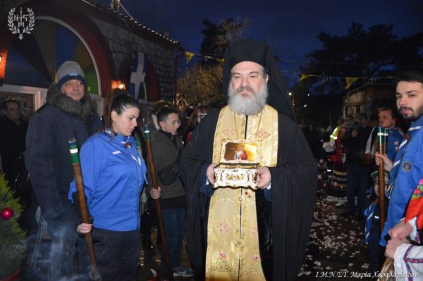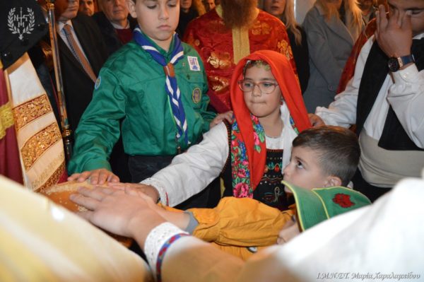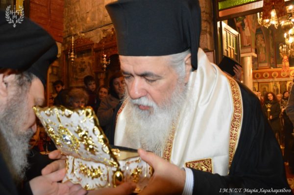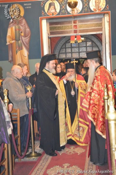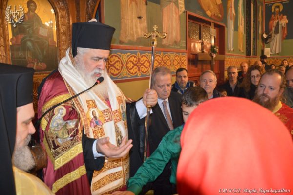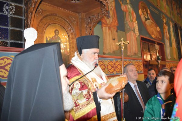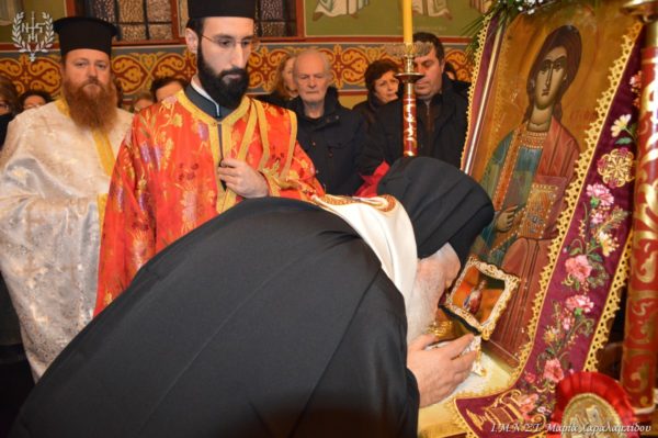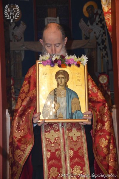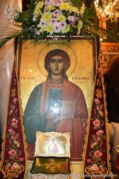 Λίγο νωρίτερα στην είσοδο του Ιερού Ναού ο Σεβασμιώτατος υποδέχθηκε απότμημα λειψάνου του Αγίου Πρωτομάρτυρος Στεφάνου το οποίο εκόμισε ο Πανοσιολογιώτατος Αρχιμανδρίτης π. Συμεών Παπαγεωργίου.
