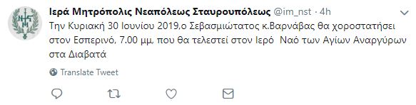 Την Κυριακή 30 Ιουνίου 2019, ο Σεβασμιώτατος Νεαπόλεως και Σταυρουπόλεως, κ.Βαρνάβας, θα χοροστατήσει στον Εσπερινό, 7.00 μμ, που θα τελεστεί στον Ιερό Ναό των Αγίων Αναργύρων στα Διαβατά.