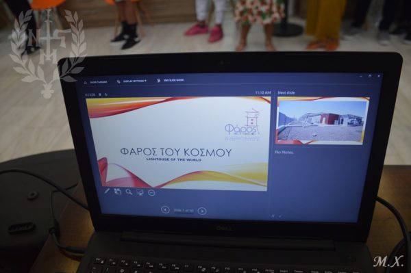 Ο Σεβασμιώτατος πρόσφερε στην Πρώτη Κυρία, ως αναμνηστικό δώρο, μια κομψή δερμάτινη τσάντα «για να κρατά πάνω της» τους ανθρώπους – κοινωνικούς εργάτες που αντάμωσε στο Σπίτι του « Φάρου του Κόσμου».