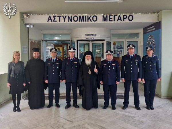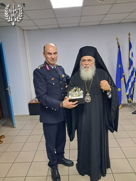 Εν συνεχεία, ο Γενικός Επιθεωρητής Αστυνομίας Βορείου Ελλάδος Αντιστράτηγος κ. Γεώργιος Παπαδόπουλος δώρισε στον Σεβασμιώτατο ένα μεταλλικό στεφάνι ελιάς, ευχαριστώντας τον για την αγάπη και τη στήριξη που επιδεικνύει διαχρονικά στο Σώμα της Ελληνικής Αστυνομίας.