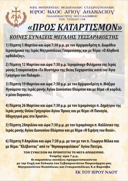 Οι εν λόγω συνάξεις πραγματοποιούνται με την ευλογία του Σεβ. Μητροπολίτου Νεαπόλεως και Σταυρουπόλεως κ. Βαρνάβα.