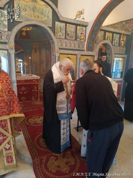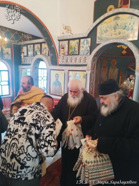 Στην Θεία Λειτουργία που τελέσθηκε στον Ιερό Ναό Αγίου Ελευθερίου εντός των Φυλακών, συμμετείχαν αρκετοί τρόφιμοι για να μεταλάβουν των Αχράντων Μυστηρίων από τον Σεβασμιώτατο, ο οποίος αφού ευχήθηκε σε όλους καλές γιορτές, προσέφερε εκτός από εόρτια δώρα και γλυκά, ρουχισμό, υποδήματα και κλινοσκεπάσματα για τις ανάγκες των κρατουμένων.