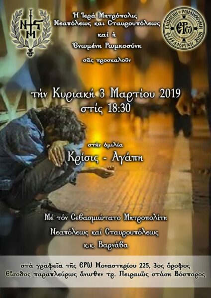H Ἑνωμένη Ρωμηοσύνη μάς προσκαλεῖ, τήν Κυριακή 3 Μαρτίου 2019 στις 18.30, στήν ὁμιλία “ΚΡΙΣΙΣ- ΑΓΑΠΗ” μέ τόν Σεβασμιώτατο Μητροπολίτη Νεαπόλεως καί Σταυρουπόλεως, κ.κ. Βαρνάβα, στά γραφεῖα τῆς ΕΡΩ, Μοναστηρίου 225, Μενεμένη, 3ος ὄροφος. Εἴσοδος παραπλεύρως ἄνωθεν τρ. Πειραιῶς, στάση Βόσπορος.