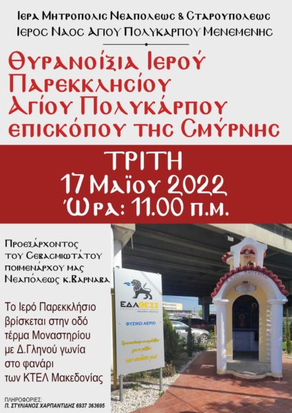 16/05/2022 16/05/2022 Ο Ιερός Ναός Αγίου Πολυκάρπου Μενεμένης της Μητροπόλεως Νεαπόλεως και Σταυρουπόλεως στην Θεσσαλονίκη θα έχει την ιδιαίτερη χαρά και ευλογία την Τρίτη 17 Μαΐου στις 11πμ να πραγματοποιήσει τα θυρανοίξια του Ιερού Παρεκκλησίου του Αγίου Πολυκάρπου του Επισκόπου της Σμύρνης. Τα θυρανοίξια θα τελέσει ο Σεβασμιώτατος Μητροπολίτης Νεαπόλεως κ. Βαρνάβας παρουσία του υπουργού Μακεδονίας Θράκης και...