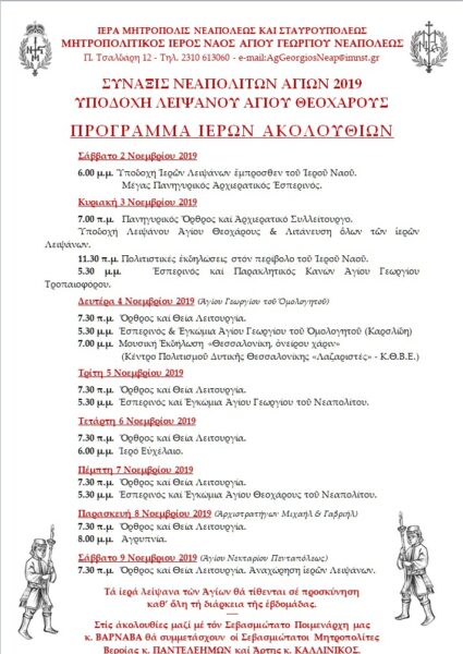 Την Κυριακή 3 Νοεμβρίου 2019 (7.30 π.μ.) θα τελεστεί Αρχιερατικό Συλλείτουργο και εν συνεχεία θα πραγματοποιηθεί η καθιερωμένη Λιτάνευση των ιερών Λειψάνων στους κεντρικούς δρόμους της Νεάπολης. Θα ακολουθήσουν πολιτιστικές εκδηλώσεις στον περίβολο του Ιερού Ναού.