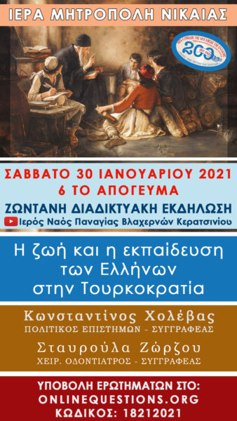 Η εκδήλωση θα πραγματοποιηθεί το Σάββατο 30 Ιανουαρίου 2021, στις 6 μ.μ. και θα μεταδίδεται ζωντανά στο youtube, στο κανάλι: “Ιερός Ναός Παναγίας Βλαχερνών Αμφιάλης – Κερατσινίου”, στον παρακάτω σύνδεσμο: