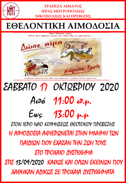 Η Ιερά Μητρόπολη Νικοπόλεως και Πρεβέζης διοργανώνει μέσω της Τράπεζα Αίματός της αιμοδοσία στον Ιερό Ναό Κοιμήσεως Θεοτόκου στην Πρέβεζα. Η εθελοντική αιμοδοσία μάλιστα σύμφωνα με την ανακοίνωση αφιερώνεται στη μνήμη των παιδιών που έχασαν τη ζωή τους σε τροχαίο δυστύχημα στις 13 Σεπτεμβρίου 2020 αλλά και όλους τους ανθρώπους που χάθηκαν από τροχαία δυστυχήματα αδίκως.