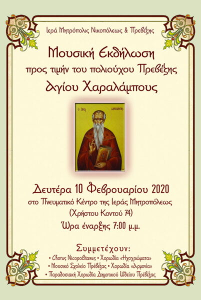 Τον Πολιούχο της Άγιο Χαράλαμπο θα εορτάσει η πόλη της Πρέβεζας κατά το διήμερο 9 με 10 Φεβρουαρίου.