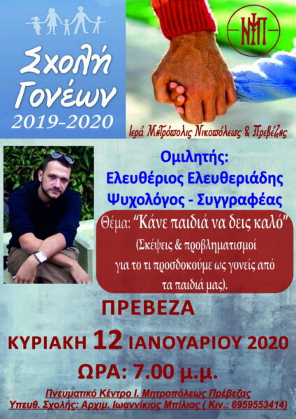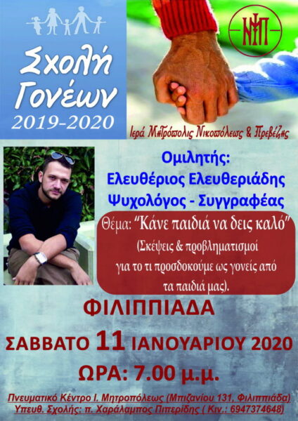 Τό Σάββατο 11 καί τήν Κυριακή 12 Ἰανουαρίου 2020 καί ὥρα 7:00μ.μ, στά Πνευματικά Κέντρα τῆς Ἱερᾶς Μητροπόλεως στήν Φιλιππιάδα καί Πρέβεζα ἀντίστοιχα, στήν συνάντηση τῆς Σχολῆς Γονέων, θα πραγματοποιηθεί ομιλία.