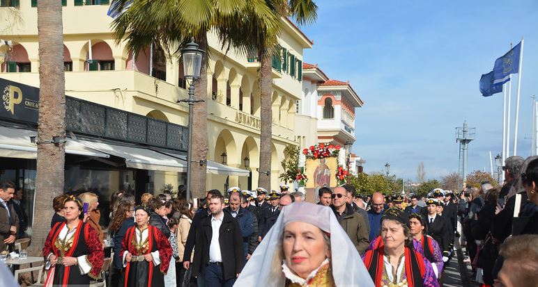 Αμέσως ακολούθησε η λιτάνευση της Εικόνας του Αγίου Χαραλάμπους στο ιστορικό κέντρο και στην παραλία της πόλης συνοδεία της φιλαρμονικής Ορφέας όπου συμμετείχε το χορευτικό του Δήμου και άγημα από την ΑΕΝ και την Πυροσβεστική.