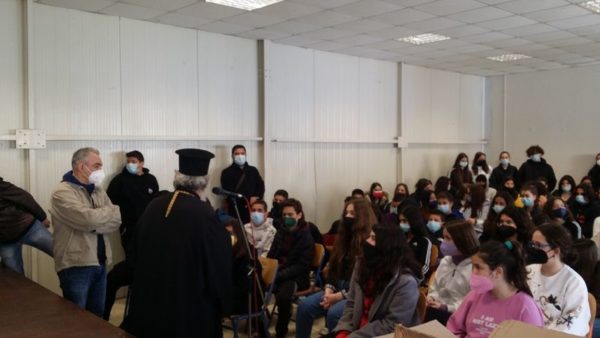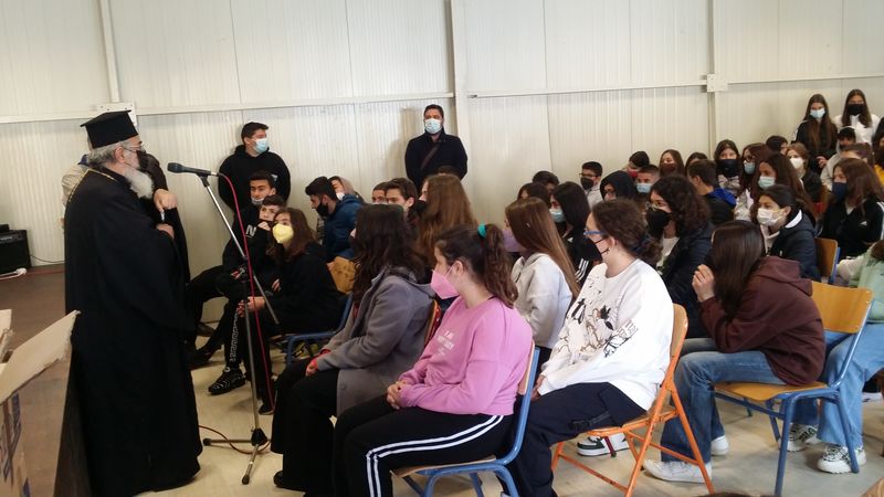 Ο Σεβασμιώτατος είχε την ευκαιρία να μιλήσει στους μαθητές και τις μαθήτριες και να τους διανείμει την Καινή Διαθήκη σε νεοελληνική μετάφραση.