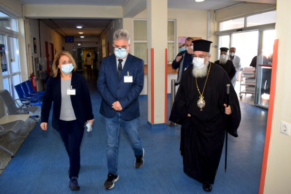 Τον Σεβασμιώτατο υποδέχθηκε ο Διοικητής του Νοσοκομείου κ. Δημήτρης Σκανδάλης και ο έχων την ποιμαντική μέριμνα των ασθενών Αιδεσ. Πρωτ. Αλέξανδρος Τζίμας.