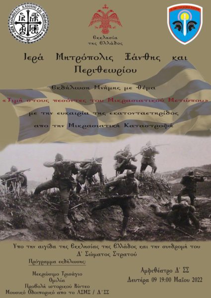 Η Ιερά Μητρόπολις Ξάνθης και Περιθεωρίου επ΄ ευκαιρία της συμπληρώσεως 100 ετών από την Μικρασιατική καταστροφή διοργανώνει την Δευτέρα 9 Μαΐου 2022 και ώρα 19:00 εκδήλωση με τίτλο «Τιμή στους πεσόντες του Μικρασιατικού Μετώπου».